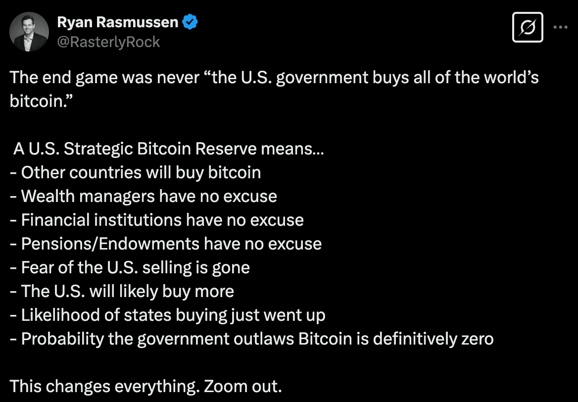 Matt Hougan, Chief Investment Officer at Bitwise, responded to the creation of a Strategic Bitcoin Reserve, outlining four key takeaways: